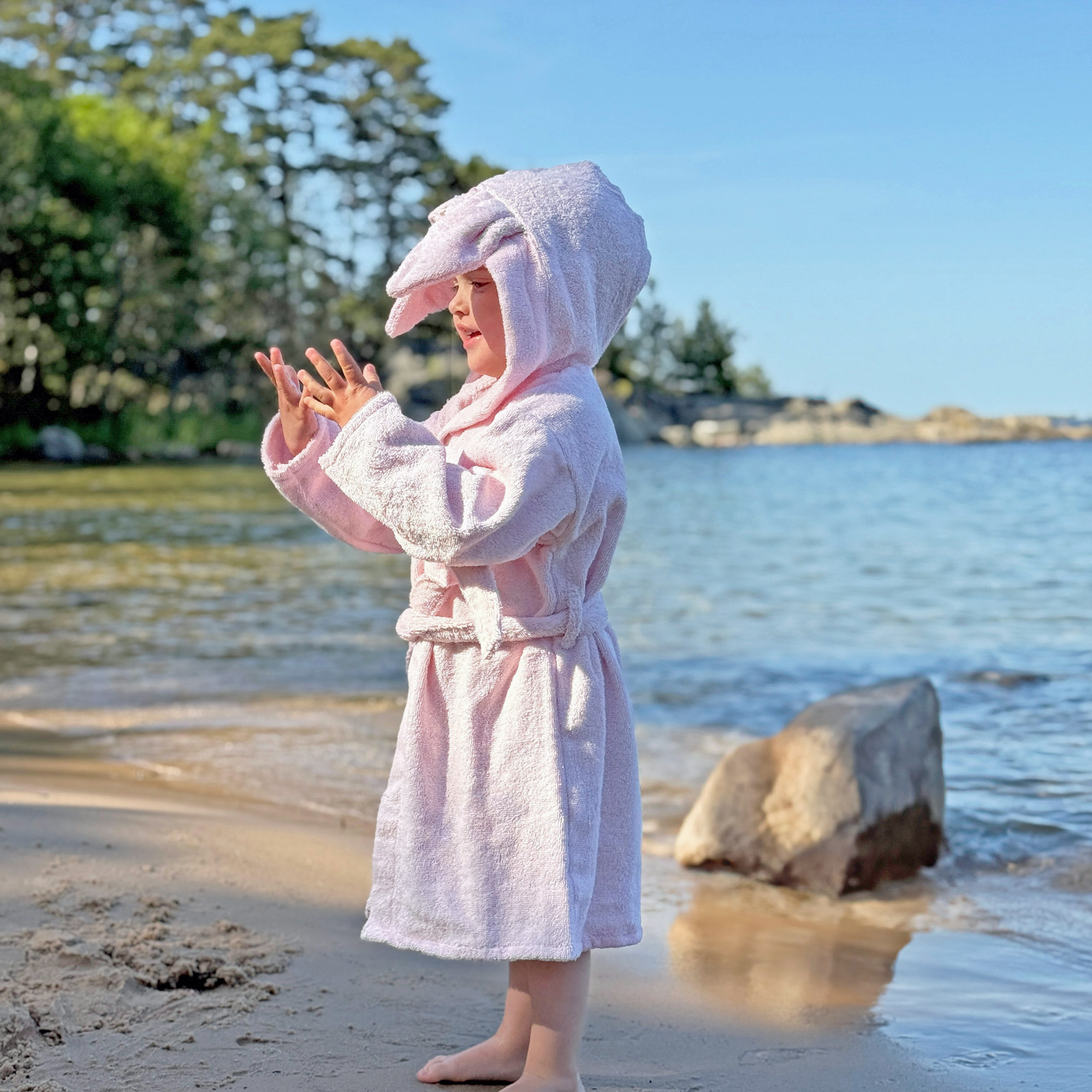 Mjuk och mysig badrock med luva med kaninöron. Lyxig ekologisk bomullsfrotté som är snäll mot barnets känsliga hud.