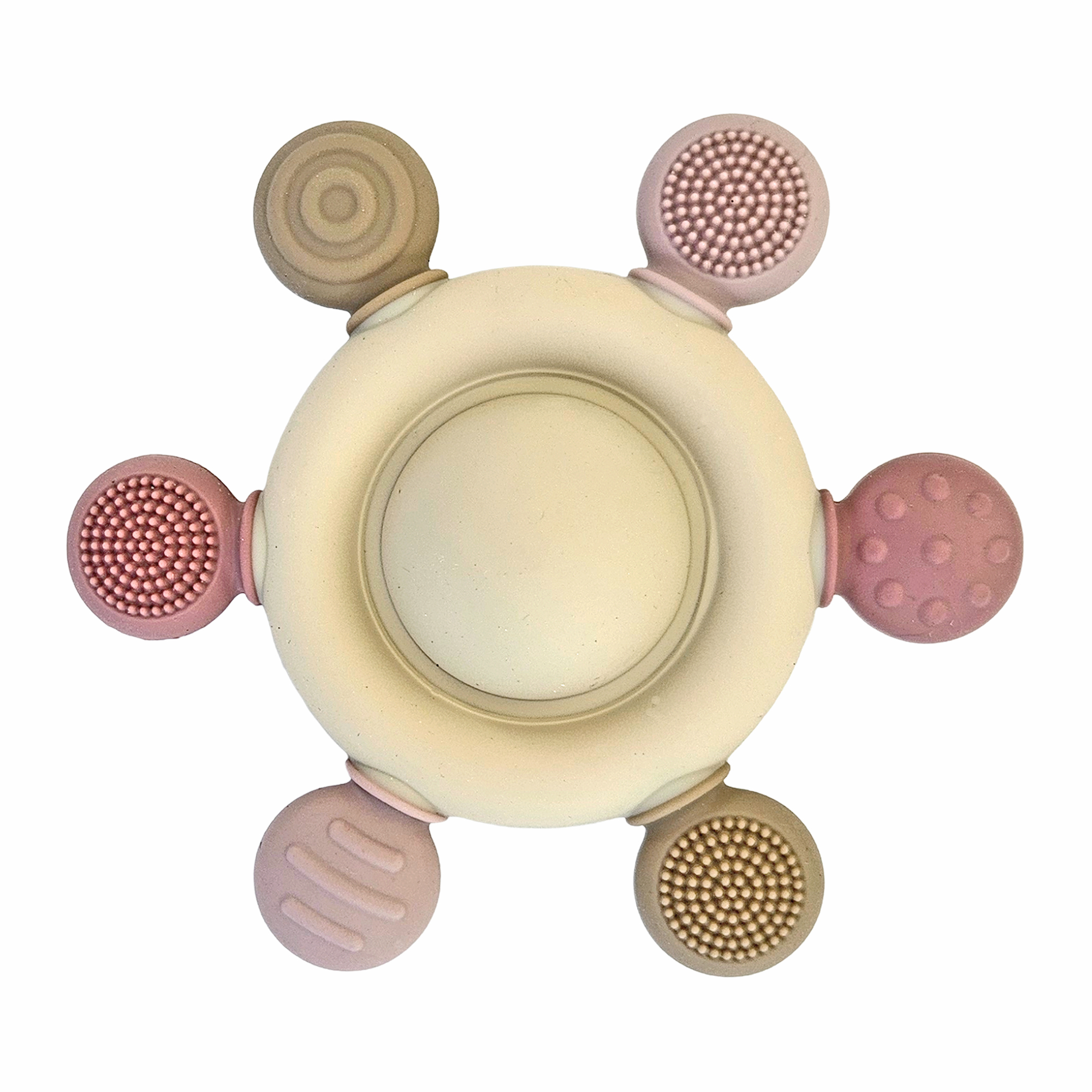 Rund bitleksak med fyra olika texturer som är sköna för babyn att tugga på när det kliar i munnen. Leksaken har också en skallra i mitten med ett rasslande ljud när den skakas.