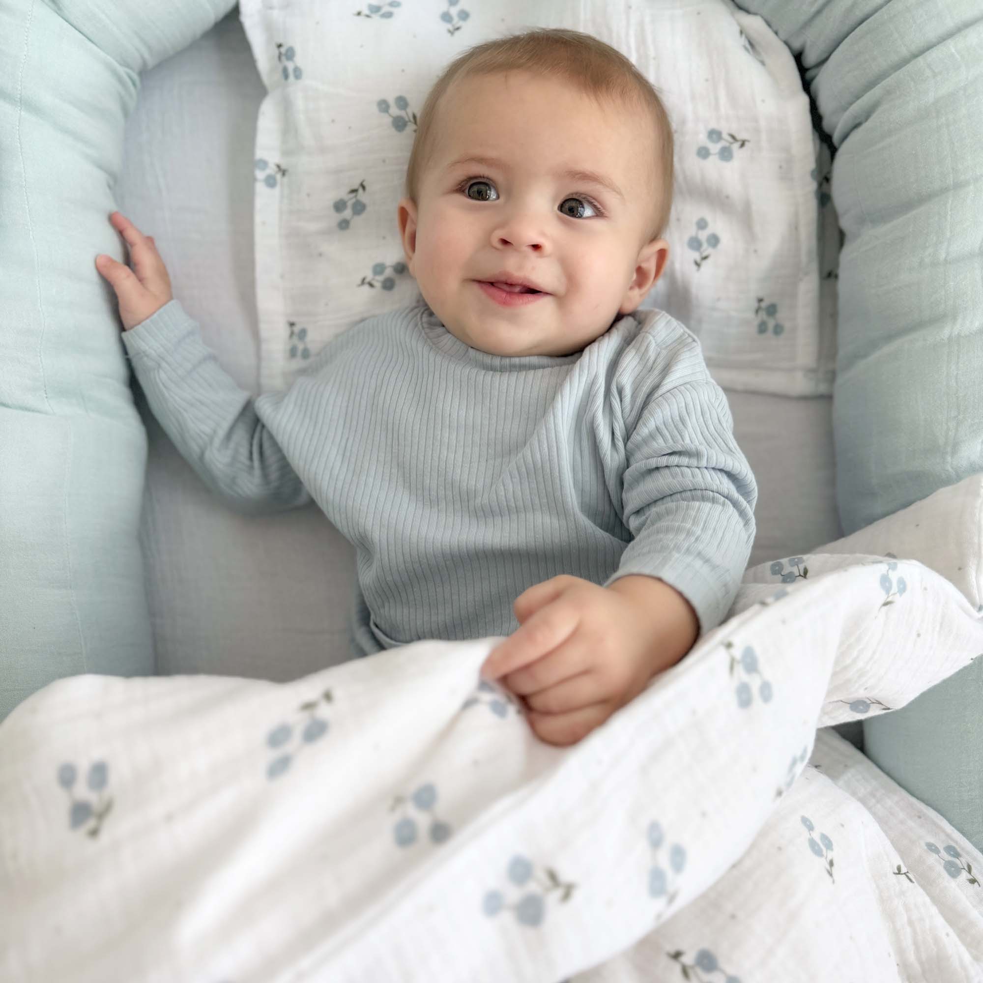 Baby Bedding Set in Crinkled Cotton Muslin in calm, beautiful colors perfect for a children's room.