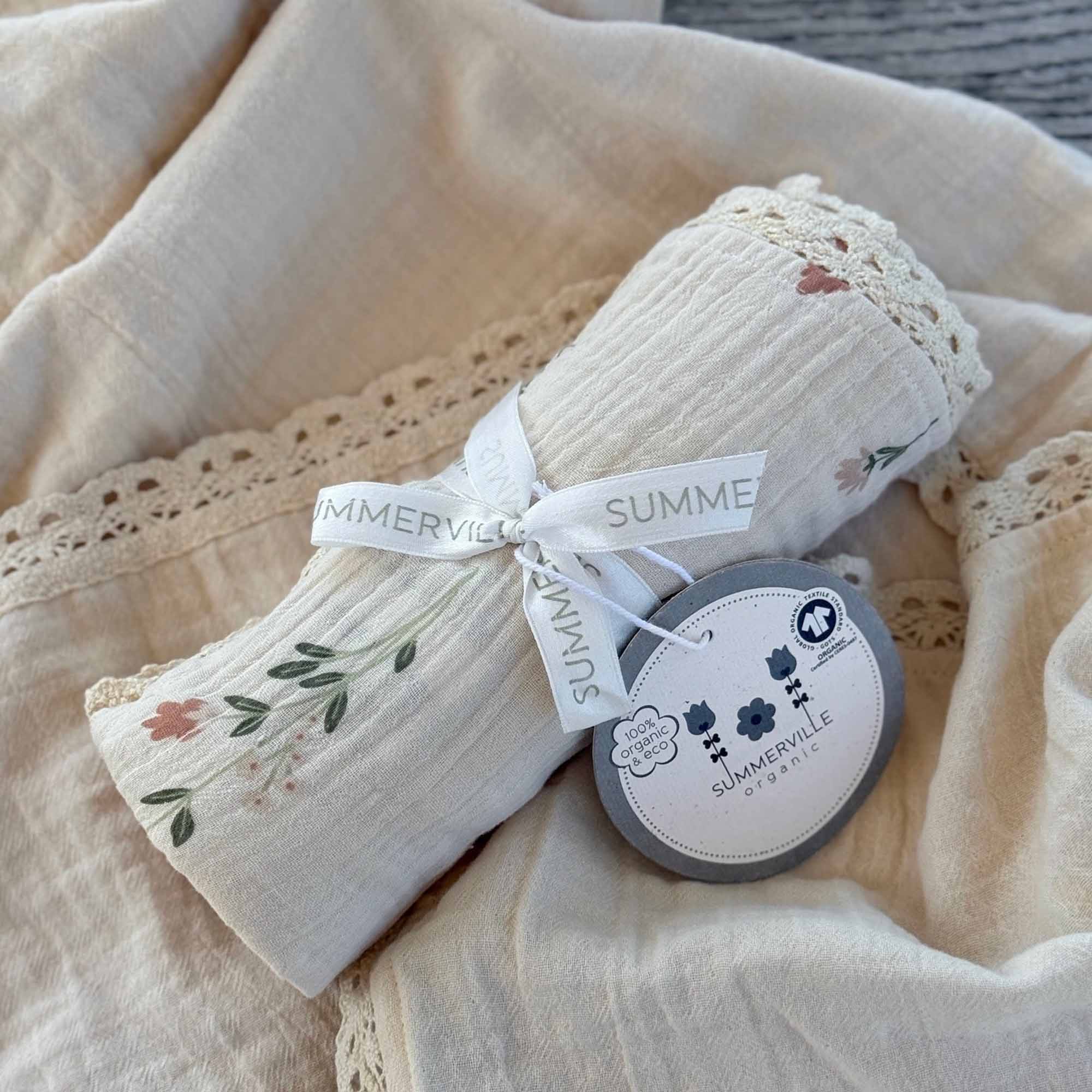 Baby blanket in soft, organic crinkled cotton muslin with a decorative lace piping.
