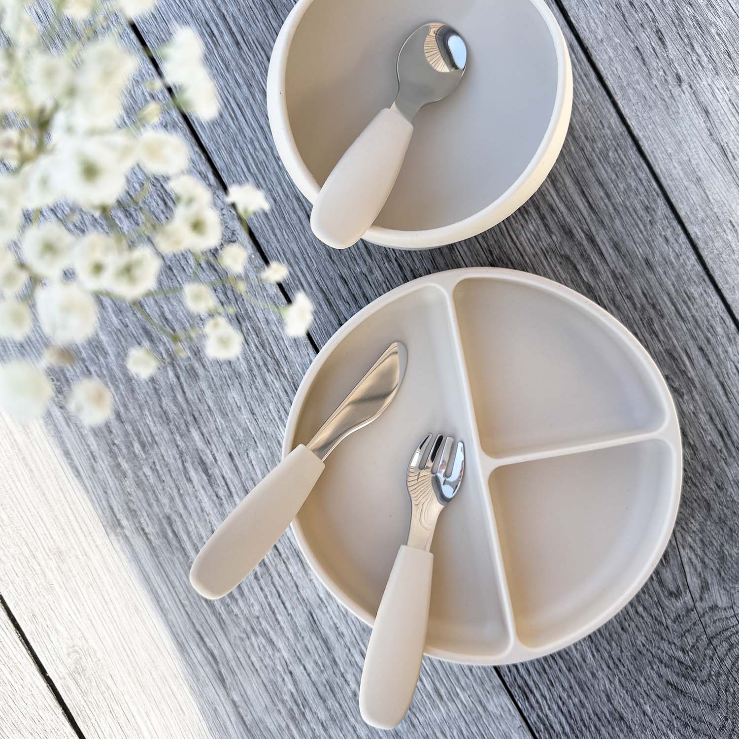 Kids cutlery in stainless steel and silicone that are easy to grip and suitable for small hands.