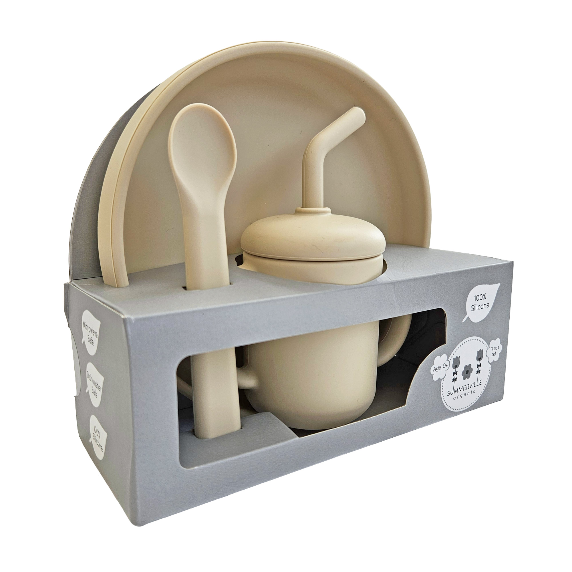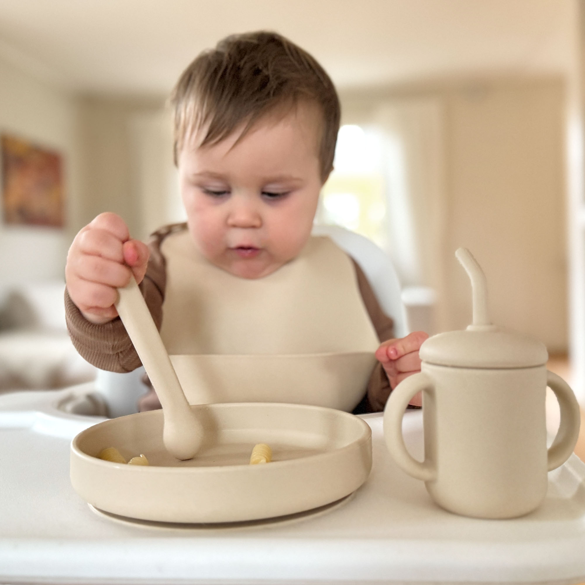 Matset för barn i silikon bestående av tallrik med kanter, greppvänlig sked och en behändig mugg med sugrör.