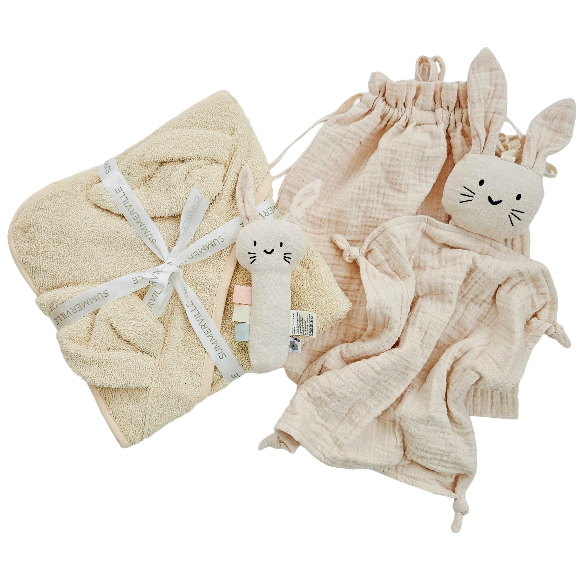Ge en nyfödd bebis en kärleksfull start i livet med ett underbart presentset fyllt med våra mjuka och trygga, ekologiska favoriter. Tillverkat i omsorgsfullt utvalda material, perfekt för känslig babyhud.